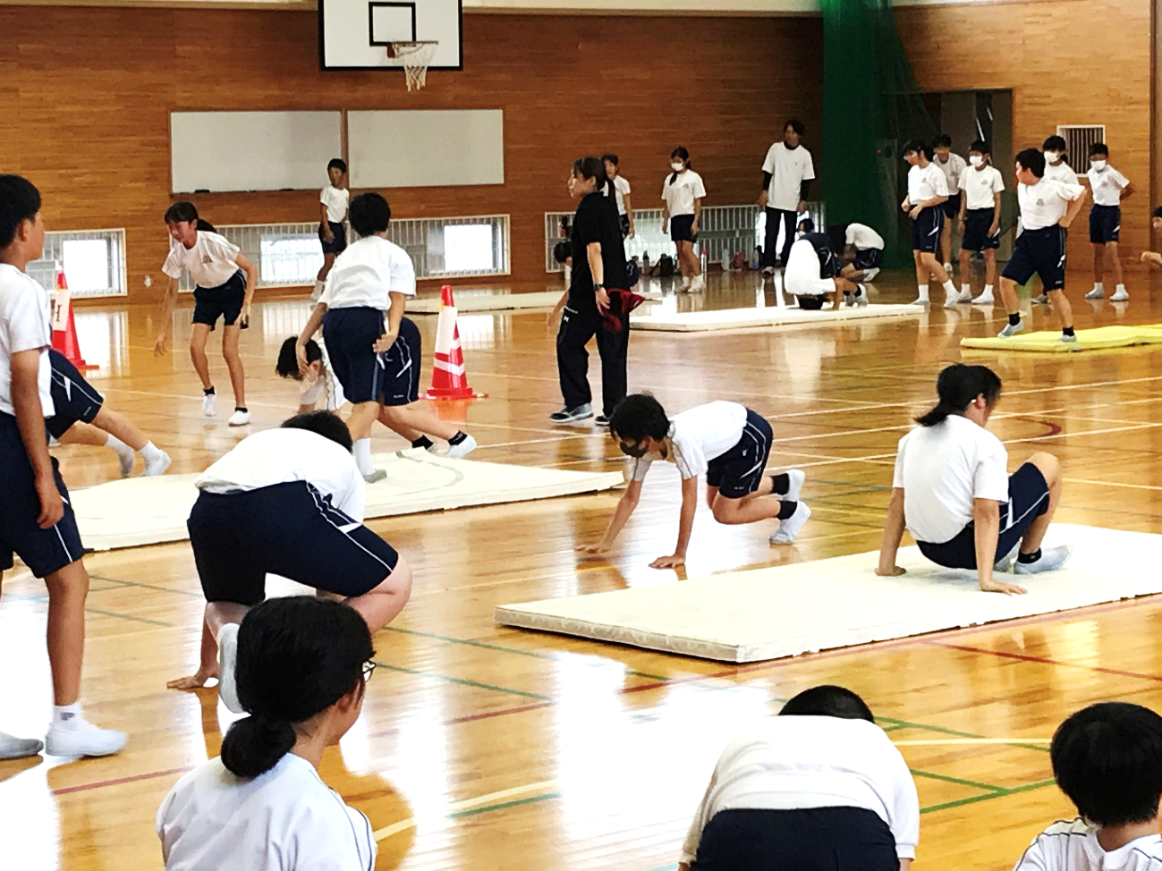 大島さんは,ご自身の経験をもとにして子どもたちに講話をしてくださいました。その後、体育館では「マット運動」の基本を教えてくださいました。
