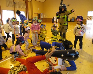 2月3日(火)に豆まき集会がありました。自分で作ったお面をつけて、みんなで鬼を退治しました。怖くて泣いてしまう子もいましたが、頑張って豆を投げることができましたよ!