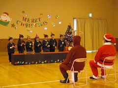 12月23日(火)に、クリスマス会がありました。 サンタさんの登場に、大喜びの子どもたち。サンタさんに質問したり、一緒に踊りを踊ったりして楽しい時間を過ごしました。プレゼントを貰うとにっこり笑顔でした。